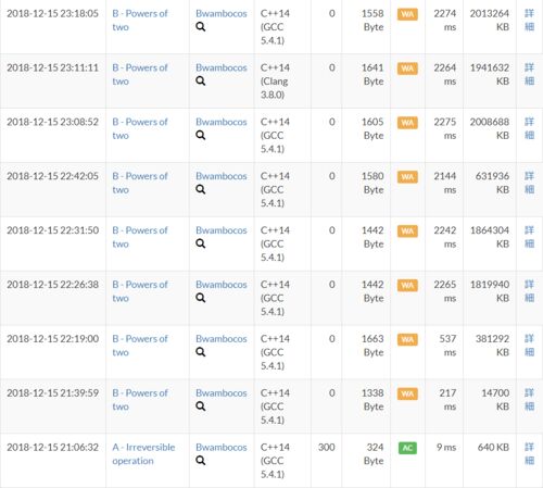 結果 A - Irreversible operation B - Powers of two 結果 1完(300 点,6:32),1758 位中 835 位,パフォーマンス 1419,レート 1535 (-12).A 問題で WA を出さずに通せたのはよかったが,B 問題がどうしても通せなかったのが残念だった. A - Irreversi…