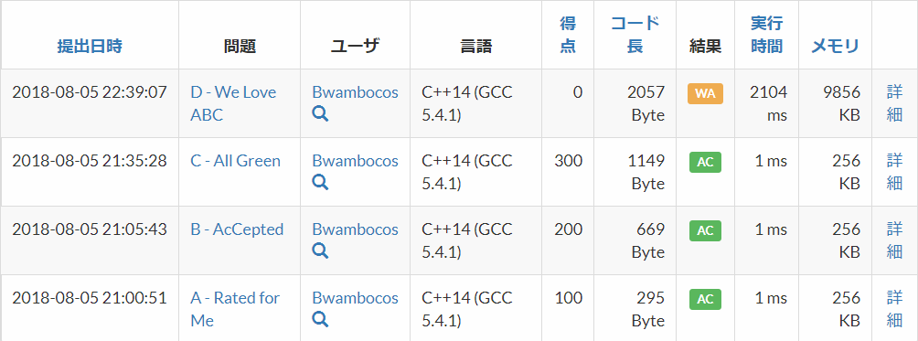 A, B, C の3完、2078 位中 249 位、パフォーマンス ...。目標であった全完を達成できなかった。C 問題で解法を考えるまでに時間をかけすぎてしまった。